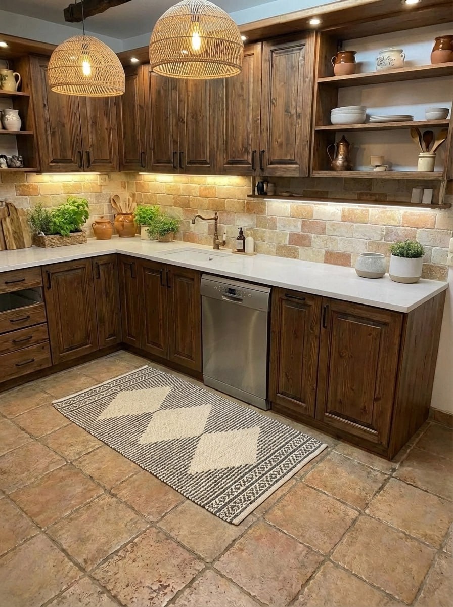 ארונות עץ אלון כהה, משטח קוורץ לבן, חיפוי אבן טבעית, מנורות ראטן