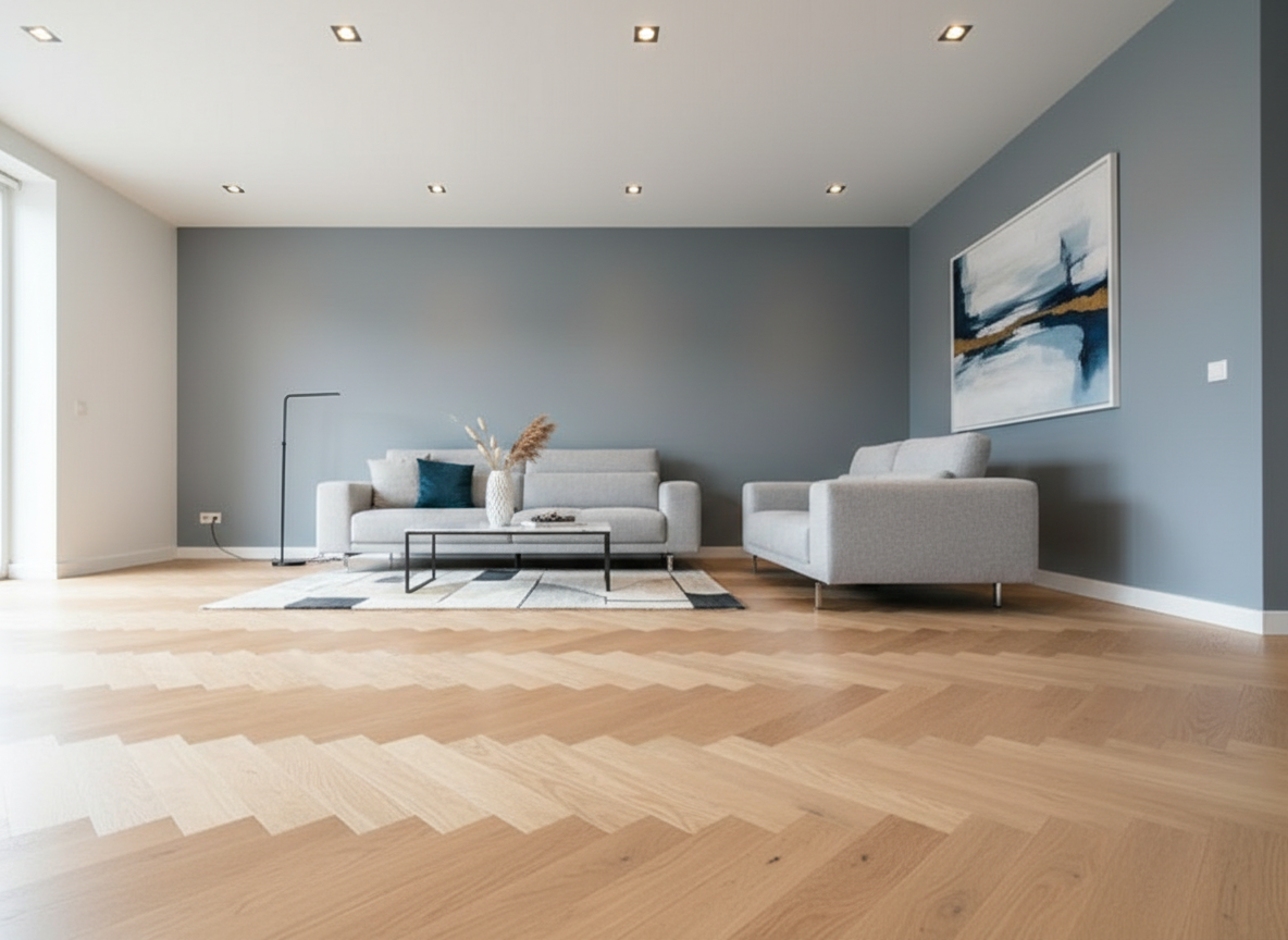 החלפת ריצוף לפרקט, התקנת 8 ספוטים שקועים, צביעה בגוון אפור-כחלחל